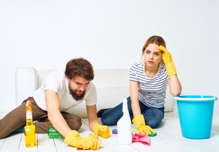 Barriendo y fregando, limpiamos la superficie de los suelos, pero las manchas persistentes y las juntas se ennegrecen, obligando a fregarlas de rodillas.